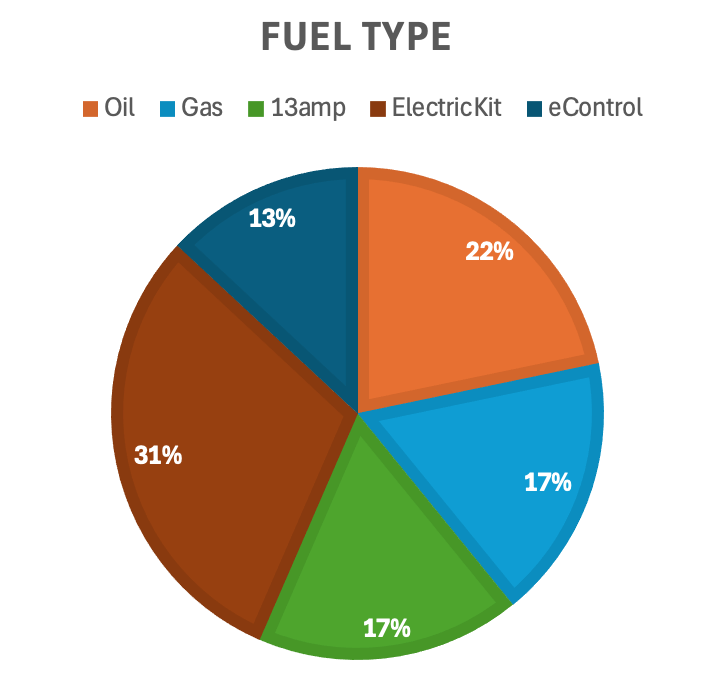 Our traditional gas and the 'always on' 13amp electric are tied in next place at 17% of total orders, with the eControl system behind at 13%.
