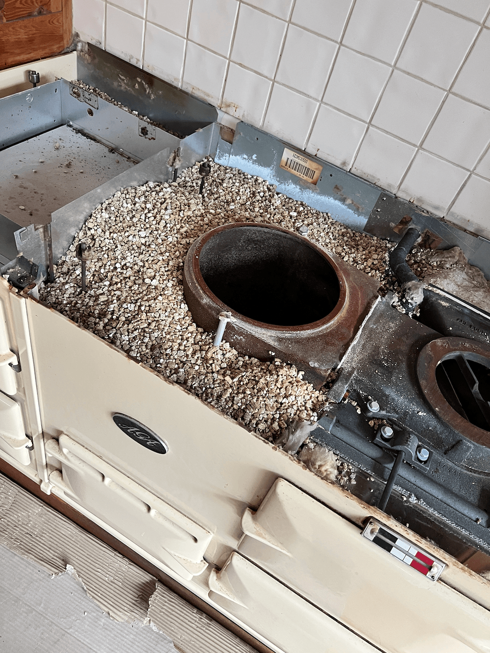 When this 13amp 4 Oven Aga Range Cooker was first installed, it was insulated using a mix of vermiculite (the stuff that looks like popcorn), and rockwool (the blankets of loft insulation you see) on top.