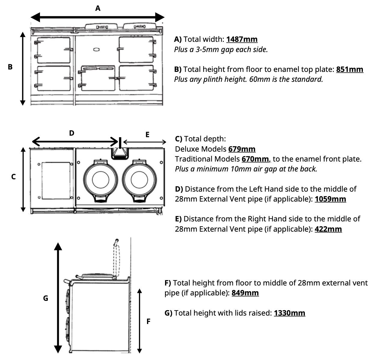Dimensions of 2 and 3 oven aga cookers: