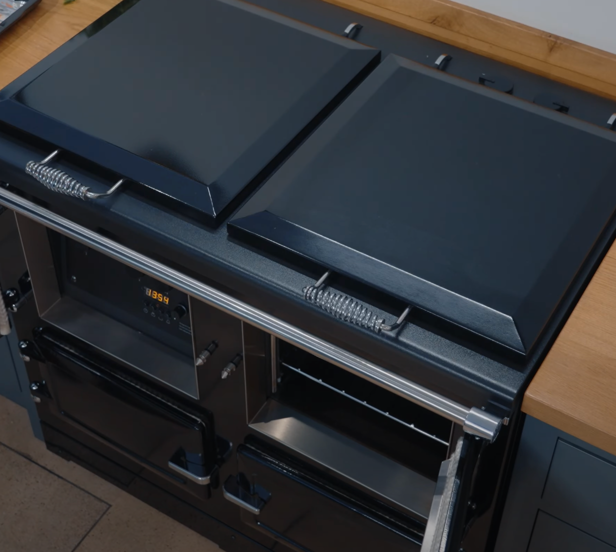 The Esse 1000X is designed to be left on at a very low slumber temperature. This slumber mode gives you roughly 85c in the top right hand oven and around 30c in the cast iron hotplate above. This slumber mode keeps the ovens saturated with a little heat for faster heat up times and reduced moisture build-up, but the thick insulation blankets around the ovens give you minimal ambient heat to the room when on slumber. You always have the option to run your ovens at a higher temperature 24/7 for increased room heat.