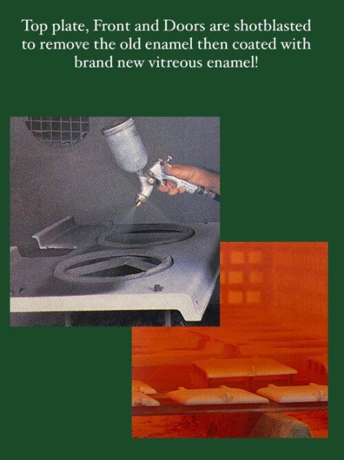 This process ensures that your enamel is completely scratch and chip free. We also offer 'pre-owned' cookers from time to time. This process is the same with the top plate and lid bands but the front remains original as there is no need to re-enamel. Since there is only the top plate to enamel, these cookers come at a reduced cost.