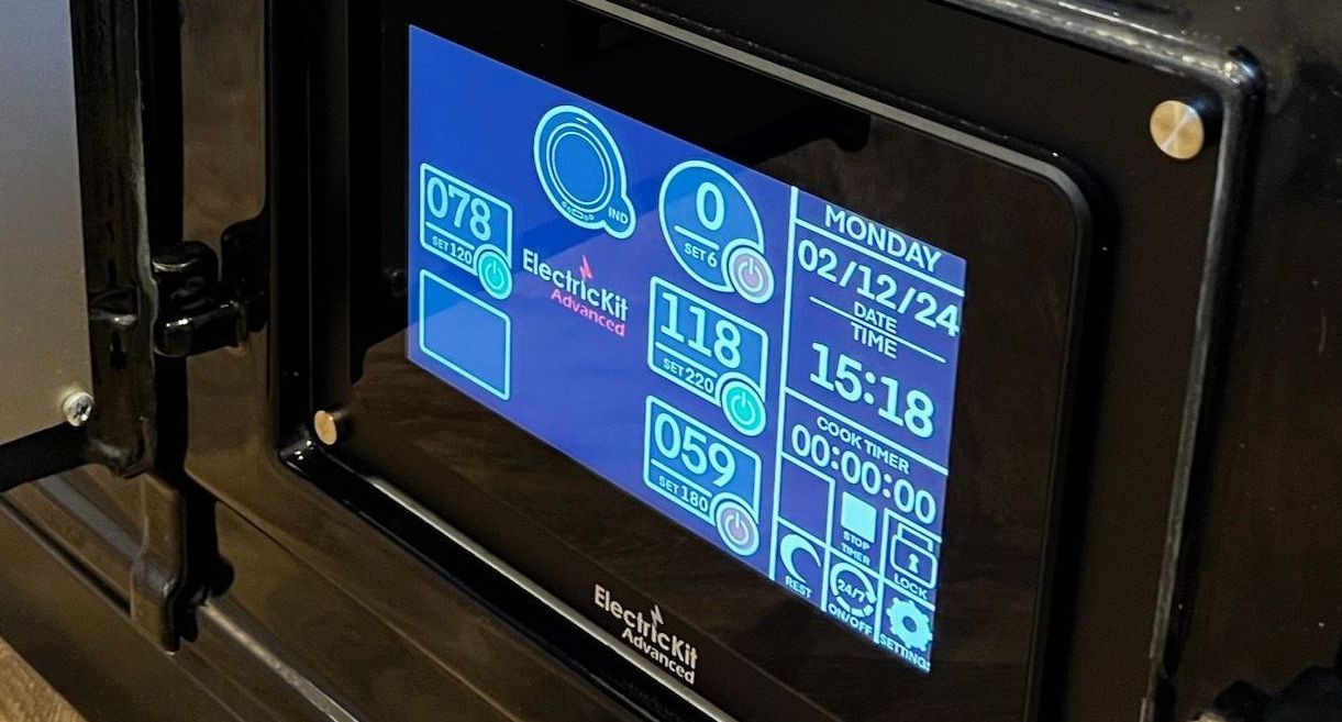 The ElectricKit Advanced Control Panel is a full touchscreen tablet (fixed in place). The display has all the settings for hotplates and ovens. It shows current and target temperatures and a slumber/rest mode, similar to Everhot Cookers. A remote screen is also available as an extra upgrade for easier access. The remote screen is included as standard on the older 'traditional' STD models (1950's/1960's), and the 30amp models.